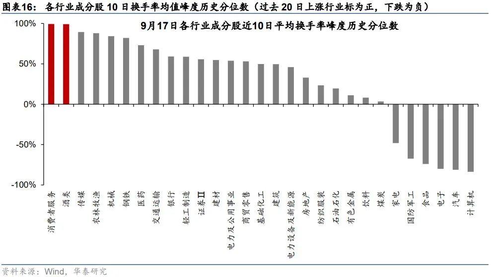 3. 关注低位高景气消费行业的配置机会,消费行业整体受到消费数据整体下滑的影响股价回调较多,但是部分行业景气度仍处高位。可以着重关注:业绩释放较多、前期回调价较大的消费者服务行业;其次是高景气但是滞涨的纺织服装和轻工制造行业。