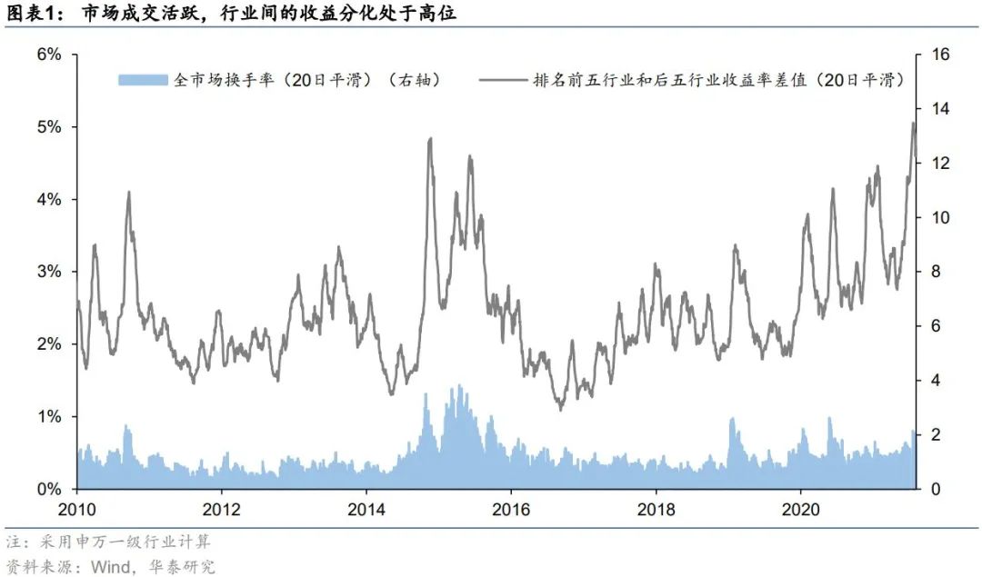 近期沪深两市日成交额保持在1.3万亿以上水平,行业间的分化程度处于历史高位,板块间轮动速度明显加快。我们认为现在的市场对于高景气方向的关注度尚在,具有持续业绩表现或是具有业绩增长空间的行业还是存在配置机会,但是活跃的成交会将高景气行业的价格快速推高,所以也需要实时关注各行业的交易拥挤风险。在行业配置上建议提高行业轮动观点的发出频率,除了挖掘高景气方向外也需要结合拥挤度对过热方向进行规避。