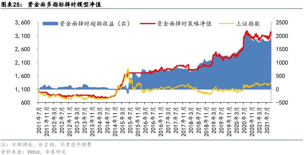 在华泰金工择时系列报告《A股择时之资金面指标测试》(2021-07-02)中,我们将参与A股投资的资金分为产业资本和金融资本,又将金融资本细分为境外机构投资者(北向资金)、境内机构投资者(公募基金、信托、私募、券商资管、保险)、境内个人投资者、杠杆资金等大类;在各资金类型中遴选和构建代表性指标,并采用统一的择时框架进行测试。以上证指数及其同期的最佳择时策略为参照,从北向资金、杠杆资金、产业资本、信托、私募类资金中筛选出9个有效的择时指标如下,并基于单指标测试结果构建多指标择时策略。根据2021年9月17日最新建模结果,融资融券交易金额、高管增持/减持、股票回购实施金额、新发行证券投资信托产品发行规模发出看多信号,陆股通买入/卖出、陆股通资金净流入、融资融券余额变化、高管总增持、股票私募基金管理规模变化发出看空信号,在[-1~1]区间中,加总信号得分为-0.11。