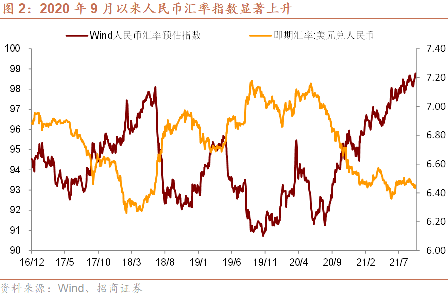 2020年9月开始,人民币对美元明显升值,今年的升值有所放缓,但是,以对一篮子货币的人民币汇率指数来衡量,人民币今年仍然走强了4.3%。这凸显出在疫情中率先恢复使得我国贸易顺差和金融市场资本流入较多,人民币相对较为广泛的货币而言更为强势。