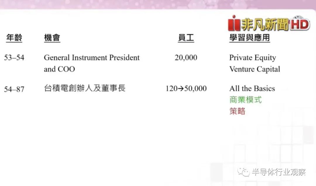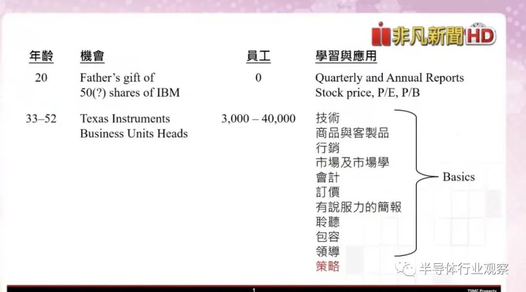在德州仪器后来的工作生涯中,张忠谋担任了德州仪器多个business uint的领导,而德州仪器的全球半导体员工也约3000激增到40000左右。按照张忠谋的说法,他的黄金时代都给了德州仪器,也是在这接近20年的德州仪器工作历程,让他学到了很多东西。他认为他获得一个重要体会就是——科技公司的CEO必须是技术出身。并且在后续的生涯中继续keep up,因为技术是一直在进步的。
