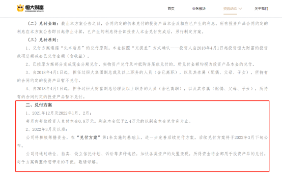 恒大财富表示,将积极筹措资金,进一步完善后续兑付方案,后续兑付方案将于2022年3月下旬公布。