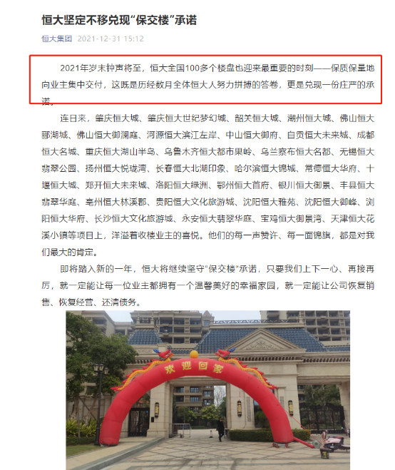 12月31日,恒大集团官微披露,2021年岁末钟声将至,恒大全国100多个楼盘也迎来最重要的时刻——保质保量地向业主集中交付。