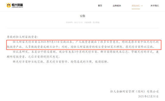 2021年12月31日,恒大财富解释,调整兑付方案原因,一方面原有兑付方案实施以来,仅兑付已到期投资产品,有投资者反映不公平;另一方面,因恒大财富投资的项目资金回笼不理想,原兑付方案难以实施。