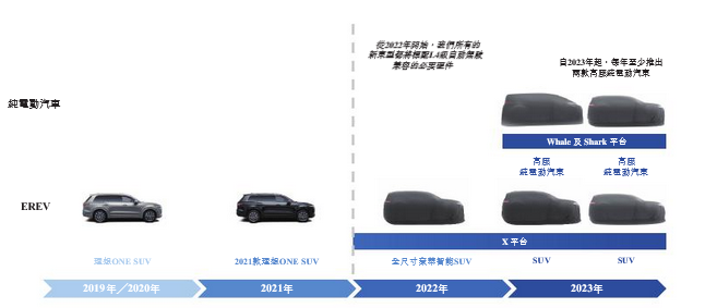 未来理想也会结束“一款车型打天下”的局面,一边是继续在原有的增程式电动平台的基础上,推出下一代增程电动平台-X平台,另一边是研发纯电平台Whale和Shark平台,布局纯电车型。根据理想港股招股书的披露的信息,理想将在2022年推出X平台的首款增程式电动车型,另外自2023年起,理想每年会推出两款纯电动车型。