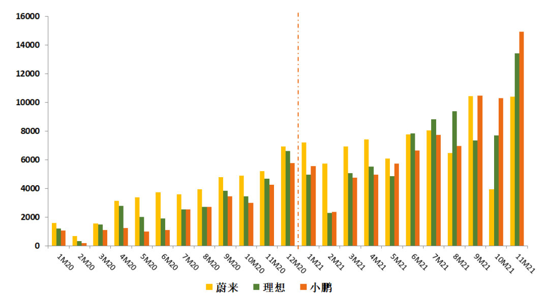 图1:2020年-2021年11月“蔚小理”的交付量(辆),资料来源:乘联会,公司公告