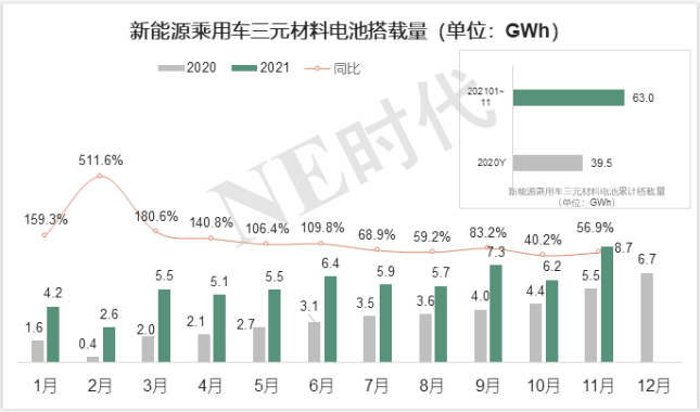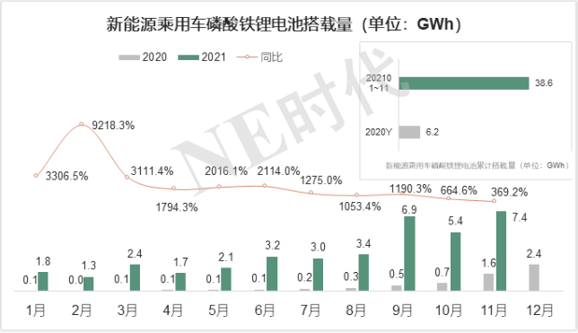 背后一个显而易见的原因是,今年1-11月份磷酸铁锂电池的搭载量相较去年提升了近370%,而三元锂电池的数字则是近57%,细分赛道的高景气度推升了磷酸铁锂上游原材料的价格,这会带来两个市场分歧: