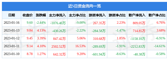 1月16日的资金流向数据方面,主力资金净流出1076.4万元,占总成交额9.0%,游资资金净流入267.35万元,占总成交额2.23%,散户资金净流入809.05万元,占总成交额6.76%。