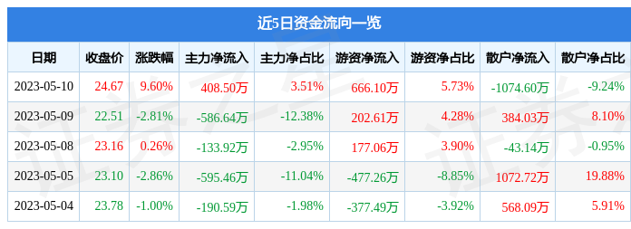 5月10日的资金流向数据方面,主力资金净流入408.5万元,占总成交额3.51%,游资资金净流入666.1万元,占总成交额5.73%,散户资金净流出1074.6万元,占总成交额9.24%。