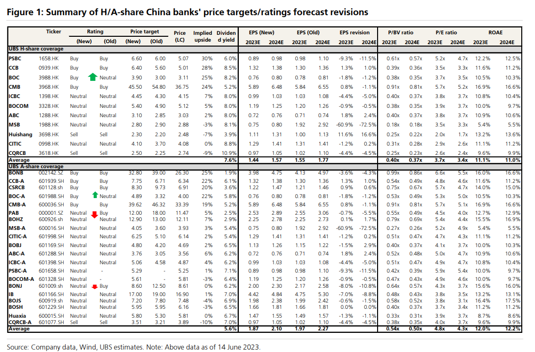 瑞银发研报指,近期举办了一次宏观考察,在考察期间没有听到重大的政策变化,但如果经济持续走软,则也认为会出现刺激措施。该行指,社会零售销售增长环比放缓,认为很大程度与收入和就业前景疲软导致信心受挫有关,专家预测2023年及中期社会零售销售增长率为6-7%。自三月份以来,房地产销售和新开工也出现了疲软迹象,专家预计2023年房地产政策将略微放松。信贷增长在4月至5月份低于预期,该行并不认为贷款增长会大幅上升,并预计2023年同比增长11-12%,因为宏观杠杆率限制了其发展。对于货币政策,该行认为MLF / 7天逆回购降息后LPR降息很可能出现,并且银行间利率应保持较低水平。该行对中国银行业维持“中性”态度,尽管今年以来表现优异,但在6月份分红季节期间仍略微偏向大型银行。下行风险是进一步的贷款利率下调,特别是潜在的房贷利率下调可能会超过存款利率下调。该行将中国银行(03988)A/H股评级由“中性”上调至“买入”,并将平安银行A股评级由“买入”下调至“中性”。