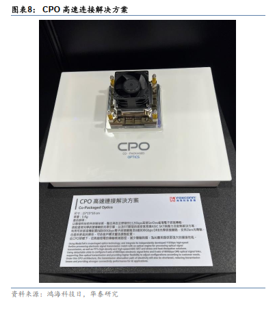 过去几年,随着GPU间通信速率的提升,光模块也迅速从200G、400G演进到800G。光模块的发热是数据中心的重要技术痛点之一。这次会上,鸿海展示的采用硅光技术的CPO(Co Packaged Optics)是投资人关注的热点。通过展会,我们了解到,CPO通过把DSP等现在在光模块中的芯片功能集成到交换机主芯片中,大幅降低系统整体的散热,并且解决铜直连的距离问题,是1.6T之后重要的技术方向,也是鸿海、博通、英伟达等企业重点发展的方向,有望对现有高速光模块形成替代。