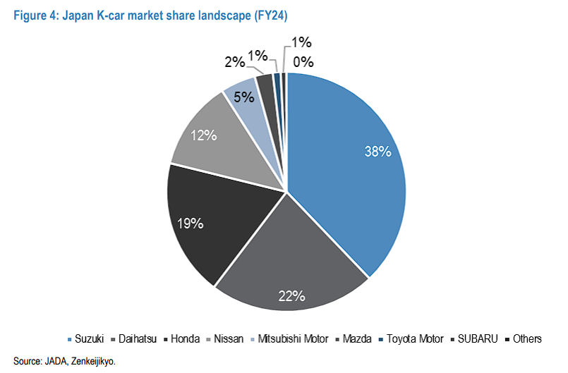 据摩根大通分析,K-car市场呈现高度集中的寡头格局,铃木(38%)、大发(22%)和本田(19%)三家厂商占据约80%市场份额。2024年K-car销量为120万辆,过去三年保持在120-130万辆水平。