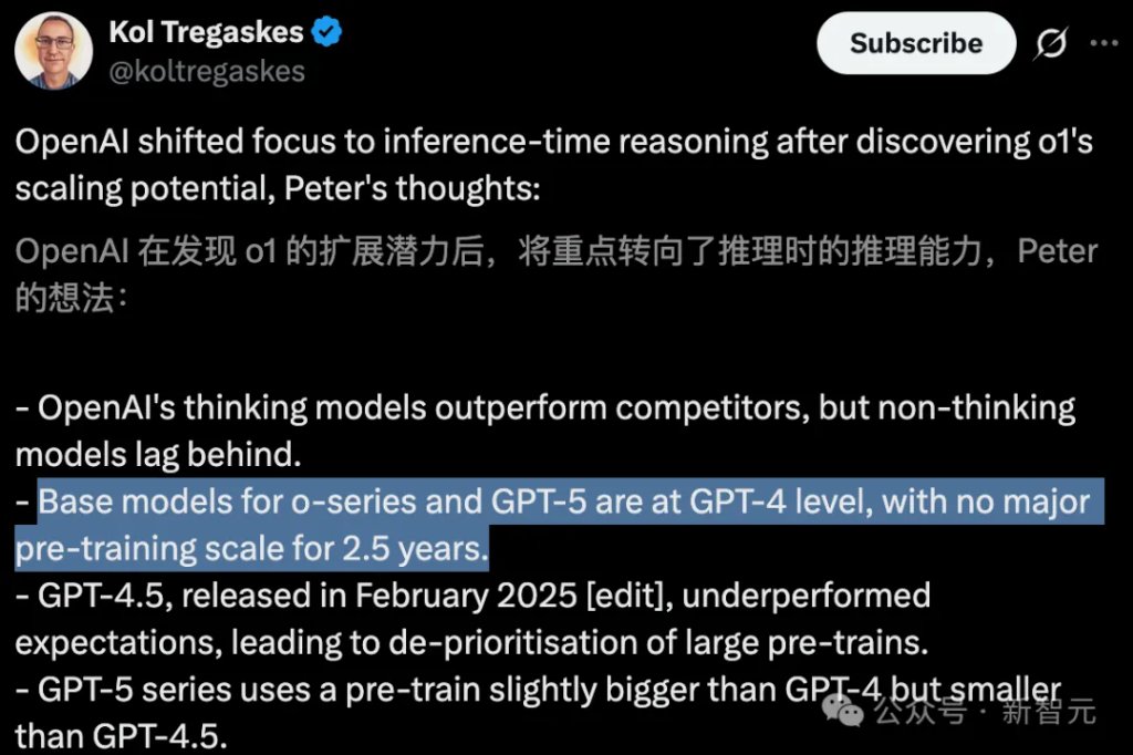 GPT的预训练,或许在GPT-4o之后触及了天花板,由此也解释了GPT-5性能未达业界预期的关键原因。