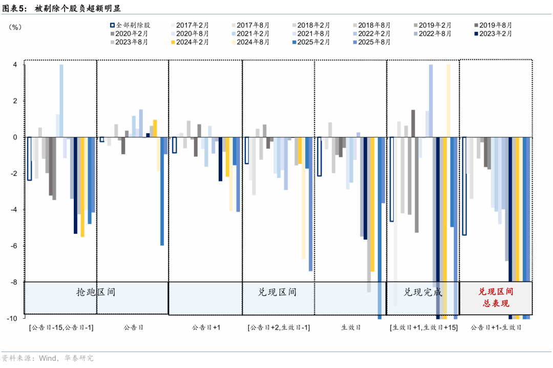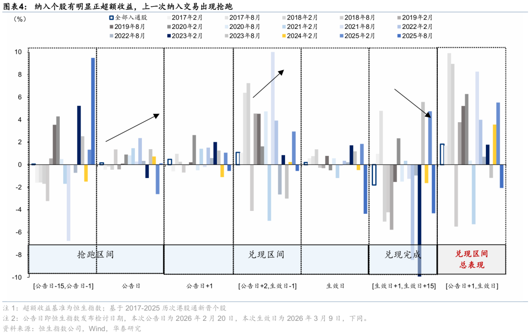 历史上看,复盘2017年2月至今港股通标的调整,恒生综指调整结果公告后一交易日(本次为2月23日)至生效日(3月9日)这一窗口期内,新入通相对恒指具有显著且稳定的超额收益,中位数及平均分别为+1.8%/+4.7%。对于被调出港股通的标的,考察期结束至公告日、公告日至生效日区间均显著跑输市场,对应期间中位数/均值分别为(-4.9%/-3.9%、-5.4%/-7.6%),需关注对应个股的流动性压力。