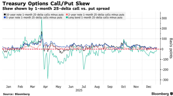 过去一周,为对冲美国国债风险而支付的溢价已回落至中性水平,此前在2025年最后两周,看跌期权的溢价高于看涨期权。回落至中性水平反映出投资者对看涨期权和看跌期权的溢价趋于相等,这与之前为对冲长期债券抛售风险而支付更高溢价的做法有所不同。