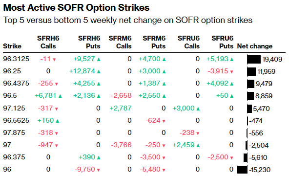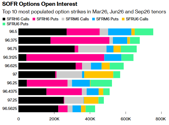 从SOFR期权(截至2026年9月到期)的整体未平仓合约情况来看,96.50行权价的风险仍然最高,该行权价持有大量2026年3月到期的看涨期权和看跌期权。此外,2026年3月到期的96.375和96.3125看跌期权也存在较大风险,而96.75行权价则存在相当数量的2026年3月和2026年6月到期的看涨期权。