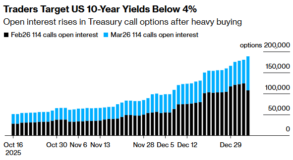 智通财经APP获悉,美国国债期权交易员正在加大押注,预计 10 年期美国国债收益率将突破近期区间,并在未来几周内跌破 4%,降至 11 月以来的最低水平。自去年12月底以来,期权市场的多头倾向持续增强,此前投资者一直处于观望状态,等待本周开始陆续公布的、不受美国政府停摆影响的关键经济数据。过去一个月,基准10年期美国国债收益率在0.1个百分点左右的范围内波动。