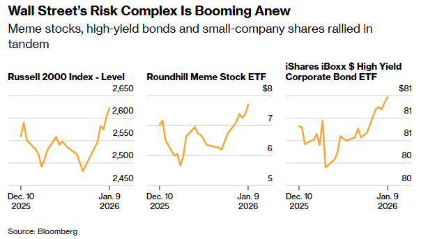 2026年首个完整交易周,华尔街的风险情绪正再度沸腾。一场从谜因股、高收益债券到小型公司股票的跨资产同步上涨行情,丝毫没有放缓迹象。