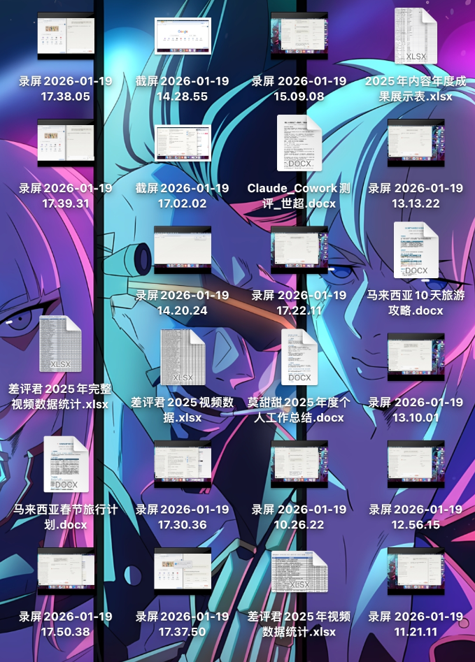作为一个究极 J 人,世超的桌面本来是相当干净的。只不过今天为了测评 Cowork 多出来不少录屏,系统默认按时间命名,堆一起实在有点难绷。