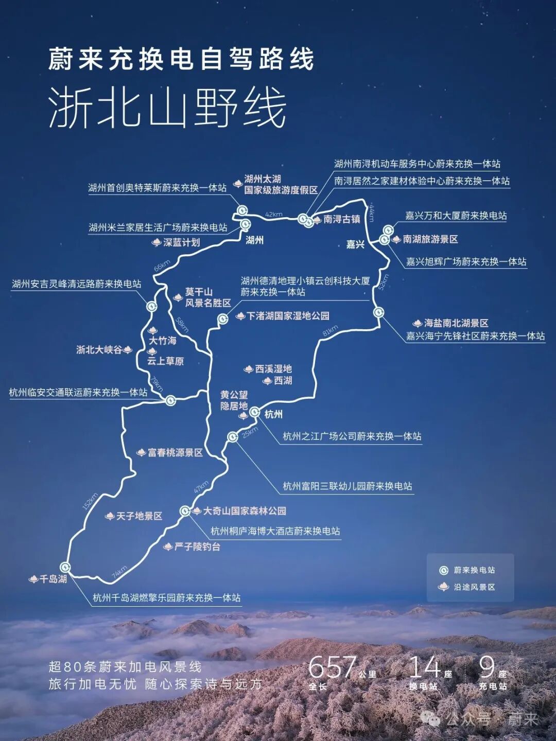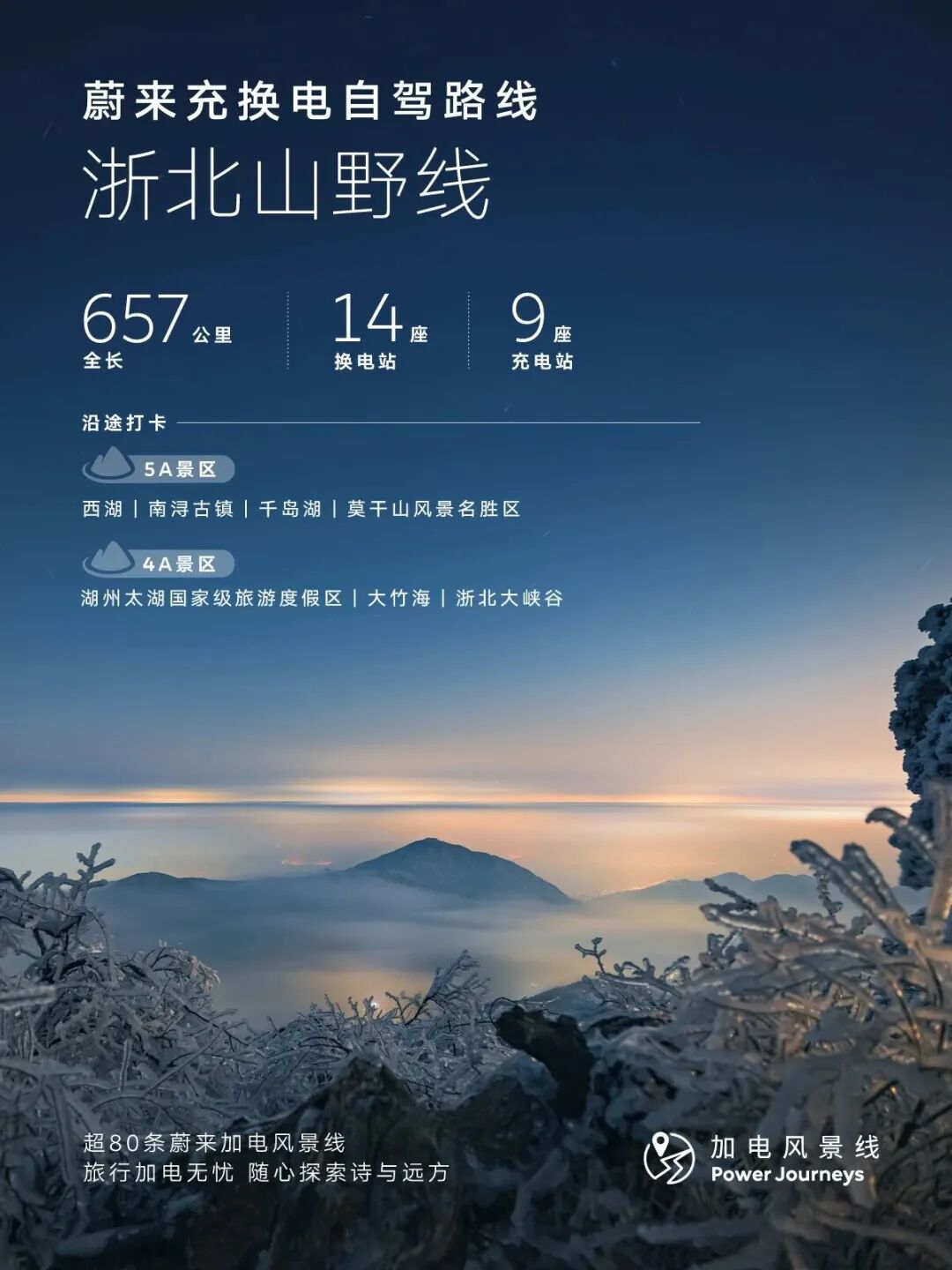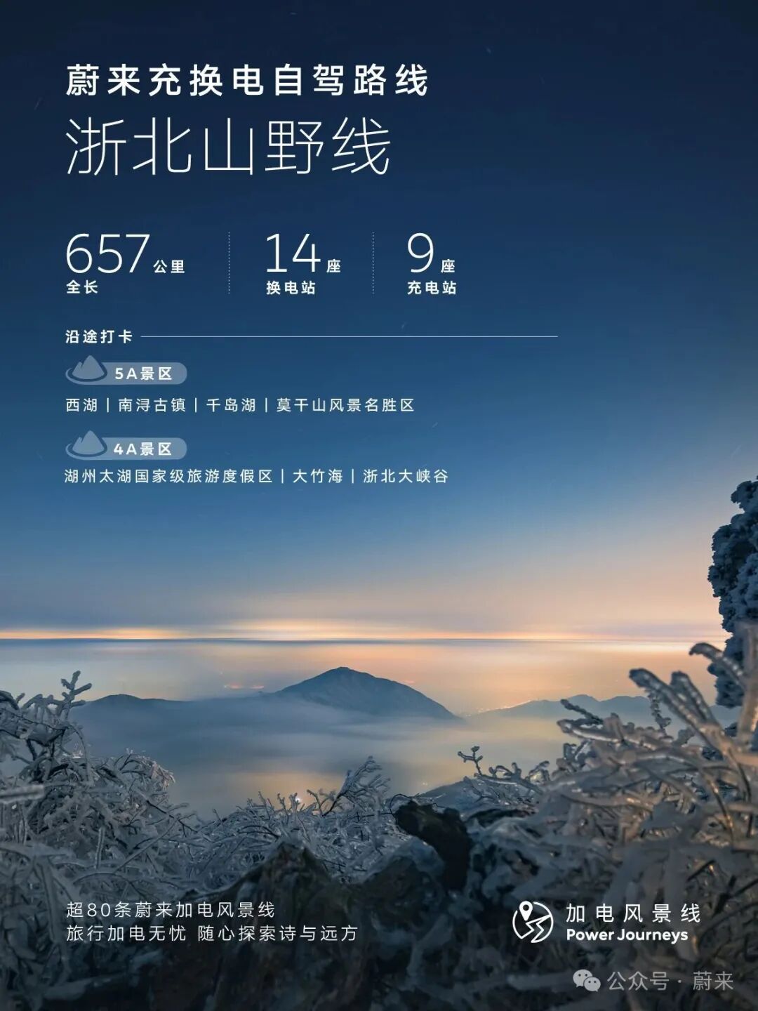 江浙沪的小伙伴,别再问冬天去哪玩了,浙北这条被蔚来充换电资源覆盖的蔚来“加电风景线”直接封神!全程657km,串联起杭州、富阳、桐庐、安吉、湖州、嘉兴等多个市县区及周边知名景点,沿途布局14座换电站、9座充电站。一路加电无忧,冰雪、温泉、竹海一站式打卡,小众又出片,赶紧码住!🏔️2-3日冬季精华段推荐📍路线:杭州→安吉→德清体验:冰雪运动+温泉泡汤+山居静赏+围炉观星❄️杭州:冬季的西湖别有一番清冷意境。你可以沿着白堤、孤山一带散步,看湖面氤氲,残荷点缀,远山如黛。若遇上下雪,更能领略“断桥残雪”的诗意。🎿安吉:这里是华东地区的大型高山滑雪场之一,位于海拔1,168米处。拥有多条适合不同水平滑雪者的雪道,同时还能邂逅绝美的雾凇景观,是体验冰雪世界速度与激情的好去处。♨️德清:冬季的莫干山,竹林依旧苍翠。选一家心仪的温泉民宿是冬日度假的灵魂。在竹海怀抱中,让一池天然暖汤洗去滑雪后的疲惫,这才是“冰火两重天”的极致享受。很多民宿还提供围炉煮茶,夜晚也可露台仰望星空。📝实用小贴士❄️蔚来和乐道的用户上车前,还可以通过手机“一键备车”,把方向盘、座椅加热、空调都一次性设定好;蔚来、乐道等车型还配备了冰箱,在冬季就成了“暖箱”,冬天出游放热饮和食物保温都没问题。冬天更知蔚来好,有蔚来的冬天,可以让你说走就走,用车无忧。蔚来在2025年3月28日已经在浙江省正式实现了换电县县通(岱山、嵊泗两个海岛县除外),标志着蔚来换电站已覆盖浙江省陆域的每一个区县。蔚来、乐道用户无论是在日常城市通勤,还是跨城“奔县”游,都能享受到“出门换电,说走就走”的便利。 同时,充电县县通也已打通,各大新能源品牌的用户来到浙江,都可以享受便捷的加电服务,蔚来充电桩面向所有新能源用户开放,目前总电量有超85%都服务于其他品牌,油车能去的地方电车也能去!欢迎大家电车游浙江,一起加电!“加电风景线”是蔚来在2020年发起的能源布局项目:在基础设施不完善,但极具向往感的目的地部署充换电设施,满足车主加电需求,让油车能去的地方电车也能去,助力大家尽情探索旅程的旖旎风光和灿烂文明。截至目前,我们已经贯通了超80条蔚来“加电风景线”。#蔚来 #蔚来换电去哪都方便 #自驾旅行首选换电点击即刻预约试驾蔚来全系车型