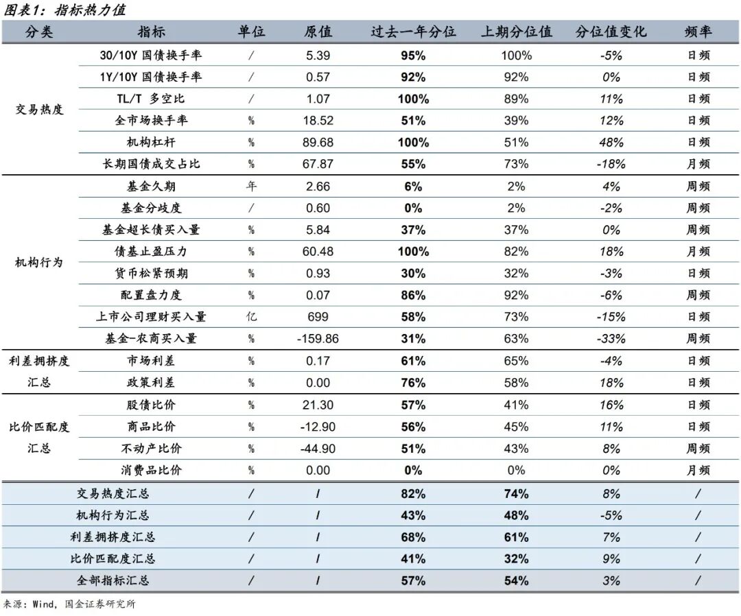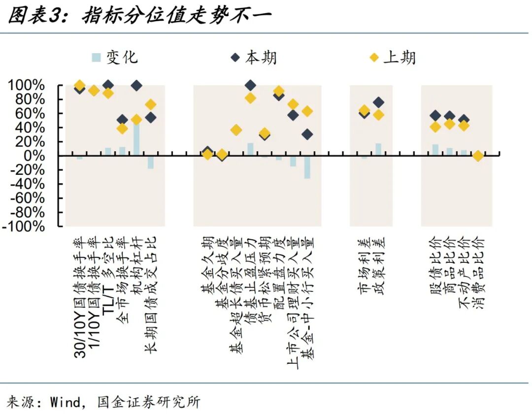 机构行为分位均值均下降5个百分点。①交易热度中,TL/T多空比、全市场换手率、机构杠杆分位值分别上升11、12、48个百分点,长期国债成交占比分位值下降18个百分点,因此交易热度分位均值上升8个百分点。②机构行为类指标中,债基止盈压力分位值上升18个百分点,其余指标分位值多不同程度回落,其中基金-中小行买入量分位值大幅下降33个百分点,因此机构行为分位均值回落5个百分点。③市场利差分位值下降4个百分点,政策利差分位值则大幅回升18个百分点,利差分位均值上升7个百分点。④股债、商品、不动产比价分位值分别上升16、11、8个百分点,比价分位均值上升9个百分点。