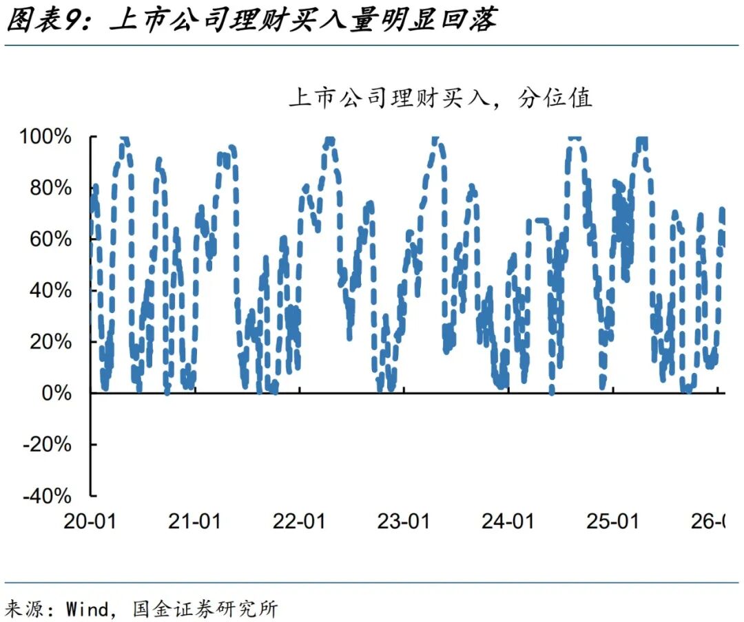 ⑦上市公司理财买入量(中性):本期上市公司理财买入量大幅回落至699亿,过去一年分位值读数下降15个百分点至58%,由过热区间降至中性区间。