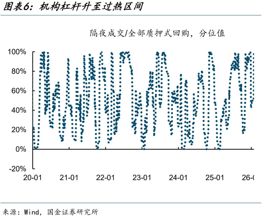 ⑤机构杠杆(过热):本期机构杠杆(隔夜成交/全部质押式回购)较上期大幅回升3.3个百分点至89.68%,过去一年分位值也大幅上升48个百分点至100%,由中性区间升值过热区间。
