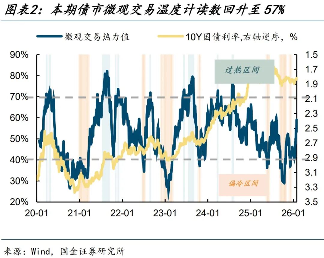 ⑥长期国债成交占比(过热):2026年1月长期国债成交占比较上期回升3个百分点至68%,过去一年分位值回落18个百分点至55%,由过热区间降至中性区间。