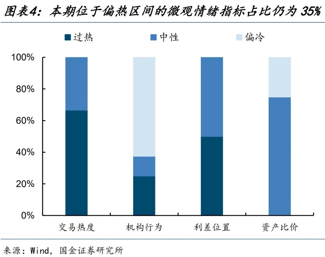 20个微观指标中,位于过热区间的指标数仍为7个(占比35%)、位于中性区间的指标数量仍为7个(占比35%)、位于偏冷区间的指标数量仍为6个(占比30%)。其中指标所处区间发生变化的是,长期国债成交占比、上市公司理财买入量均由过热区间降至偏冷区间,机构杠杆、政策利差均由中性区间升至过热区间,全市场换手率由偏冷区间升至中性区间。
