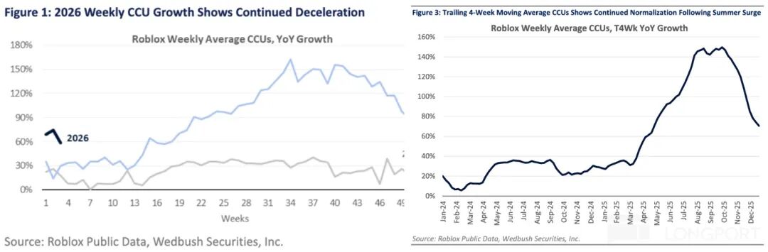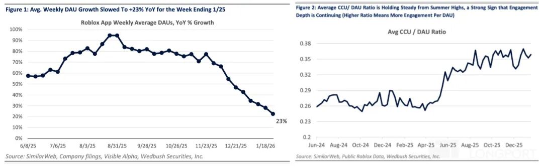 2.担忧缓解——用户生态健康:引发Roblox从11月至Genie影响之前跌跌不休的主要原因,就是Q2-Q3的几个爆款,随着开学季学生回校,热度快速下滑。第三方监测平台显示Q4用户参与度(同时在线人数)环比下滑了近40%,引发了市场对高增长持续性的担忧。