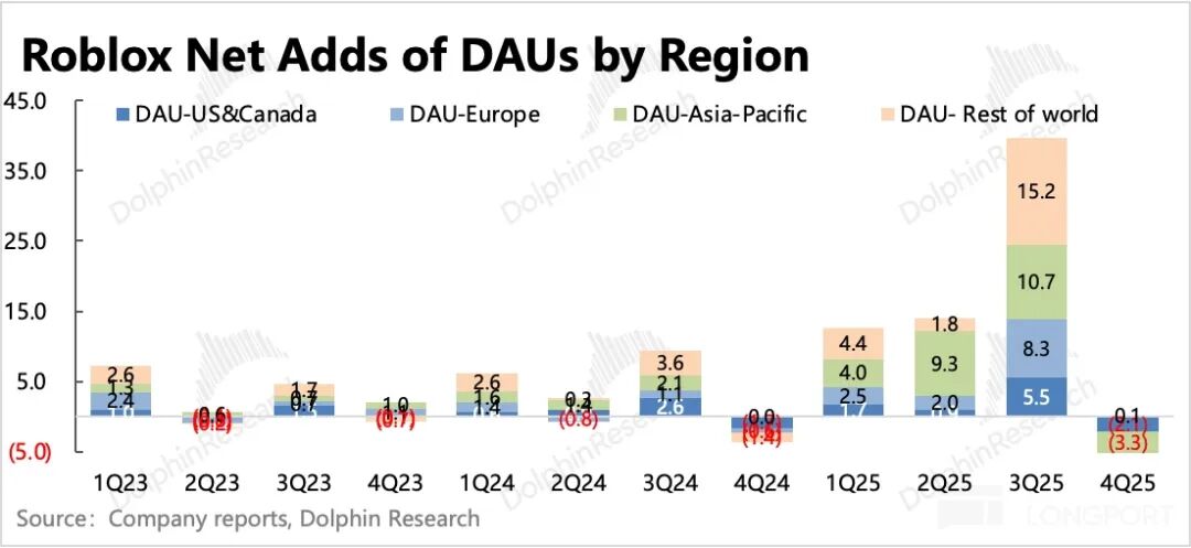 实际上看,情况没有那么糟。Q4日活增长69%,总时长提高88%,计算得人均时长也有11%的同比增加。从环比上看,下滑幅度(11%)虽然确实比往年略高(3%~9%),但25年的Q3尤其是暑假是快速拉高的历史巅峰,再加上Q4本身是返校季,因此这个降温趋势还好。