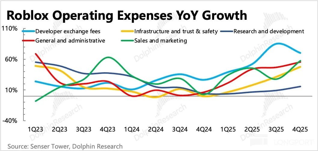 主要提高的还是开发者分成,占到了总运营支出的27%,也占到了总收入的34%;其次是基础设施和信任安全方面投入,为了支撑1.44亿用户每天2个多小时的顺畅体验,需要同步扩容服务器,保证运行稳定。