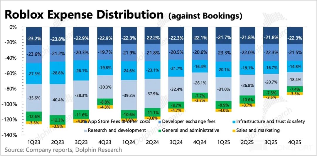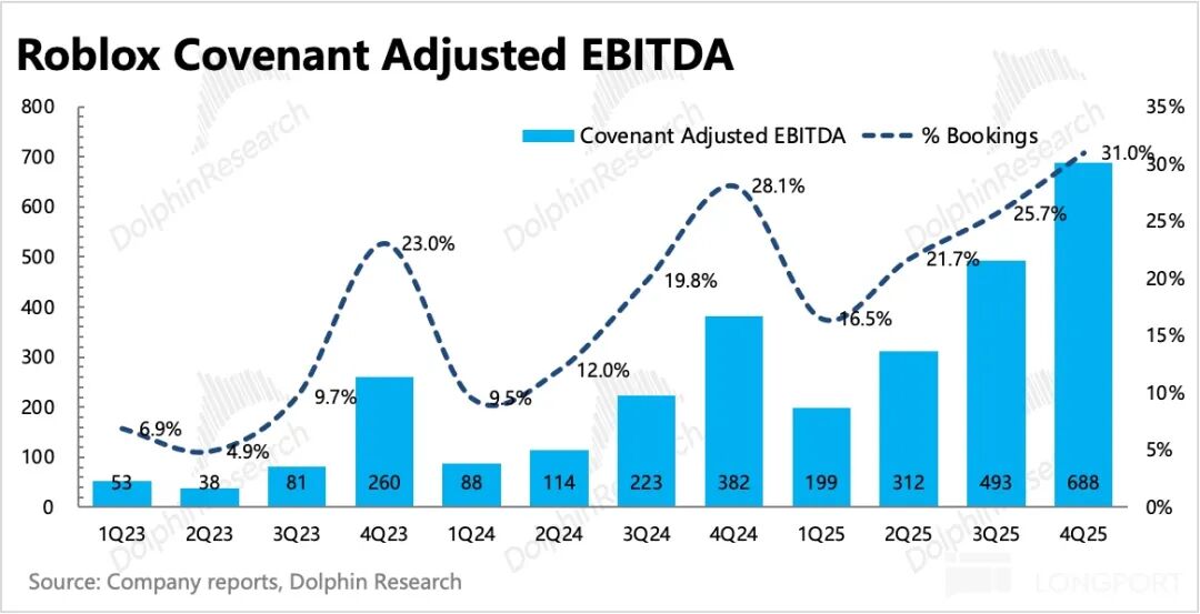 最终计算得Covenant Adj.EBITDA四季度为6.9亿,占Bookings比例为31%,达历史新高。不过由于前文所说的提高开发者分成、基建费用、信任与安全费用等支出,公司指引2026年该利润为20~21.7亿,利润率相比2025年要下降不到1pct。
