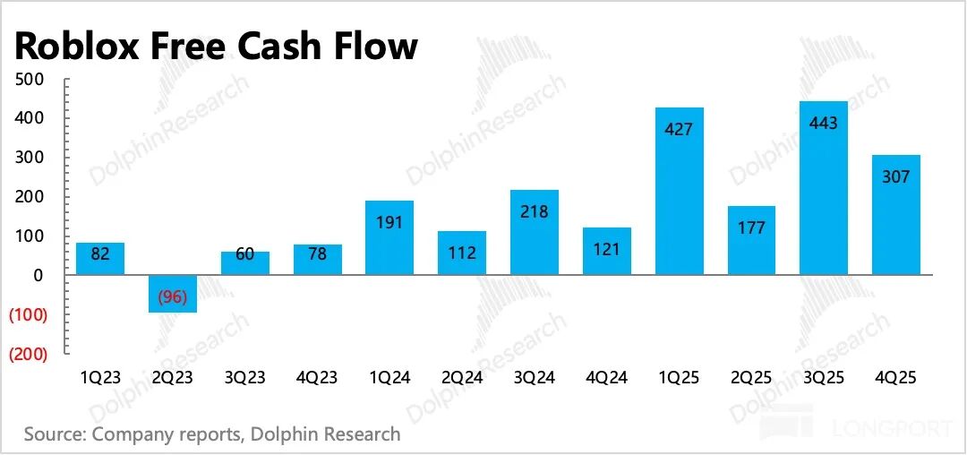 否则就会因为递延周期太长(非一次性消耗的虚拟商品,一般按照用户平均生命周期27个月来进行递延确认)、收支周期错配(收入递延,但是付给开发者的分成费用不递延)而产生差异,而低估了其商业模式下的现金流优势——截至2025年末,年收入不足70亿、看似长年巨亏的Roblox,已经积累了近45亿的净现金。