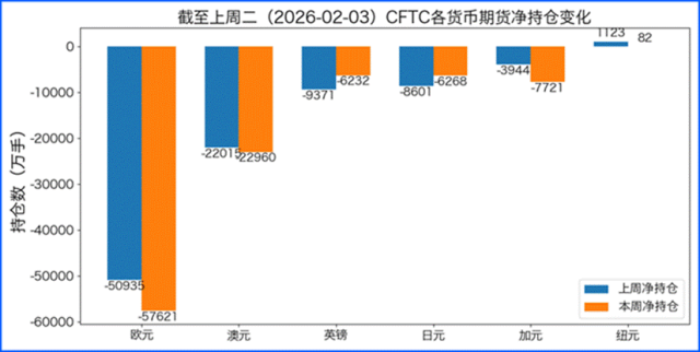 据美国商品期货委员会公布的2026-02-03期货市场头寸持仓报告显示,上周各货币的报告总持仓情况如下:欧元净空头变化6686手,澳元净空头变化945手,英镑净多头变化3139手,日元净多头变化2333手,加元净空头变化3777手,纽元净空头变化1041手,上周没有总持仓多空转换的货币。除此之外,单向总持仓变动超过20%的货币有:加元。