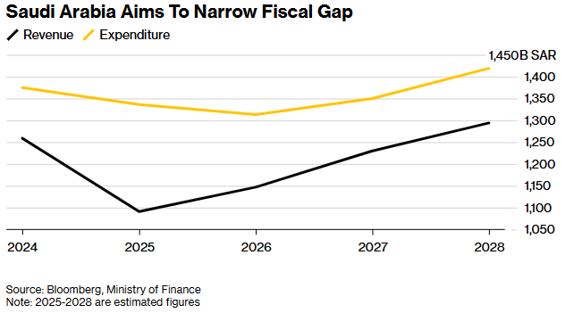 由于经济多元化倡议的支出超过了受油价疲软影响的收入,沙特阿拉伯自2022年以来一直处于财政赤字状态。官员们表示,持续的赤字是为了继续支持经济投资而做出的刻意选择。他们预计赤字将从2025年的5.3%缩小至明年的3.3%,而华尔街经济学家估计这一数字会更高。
