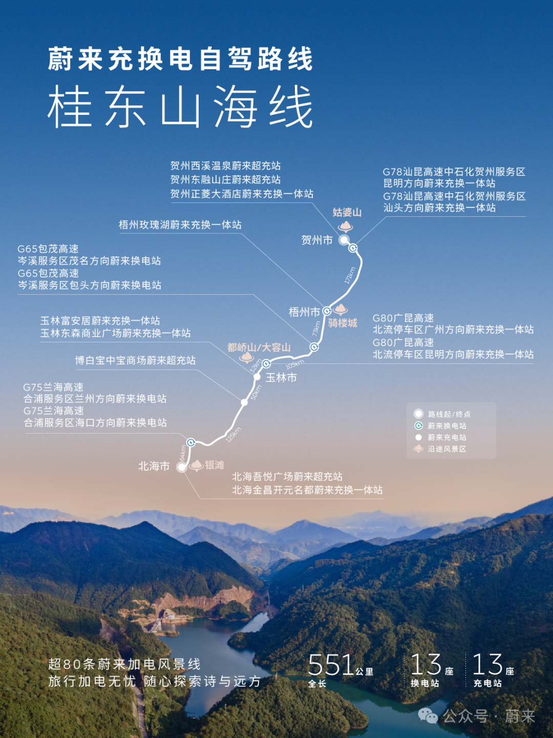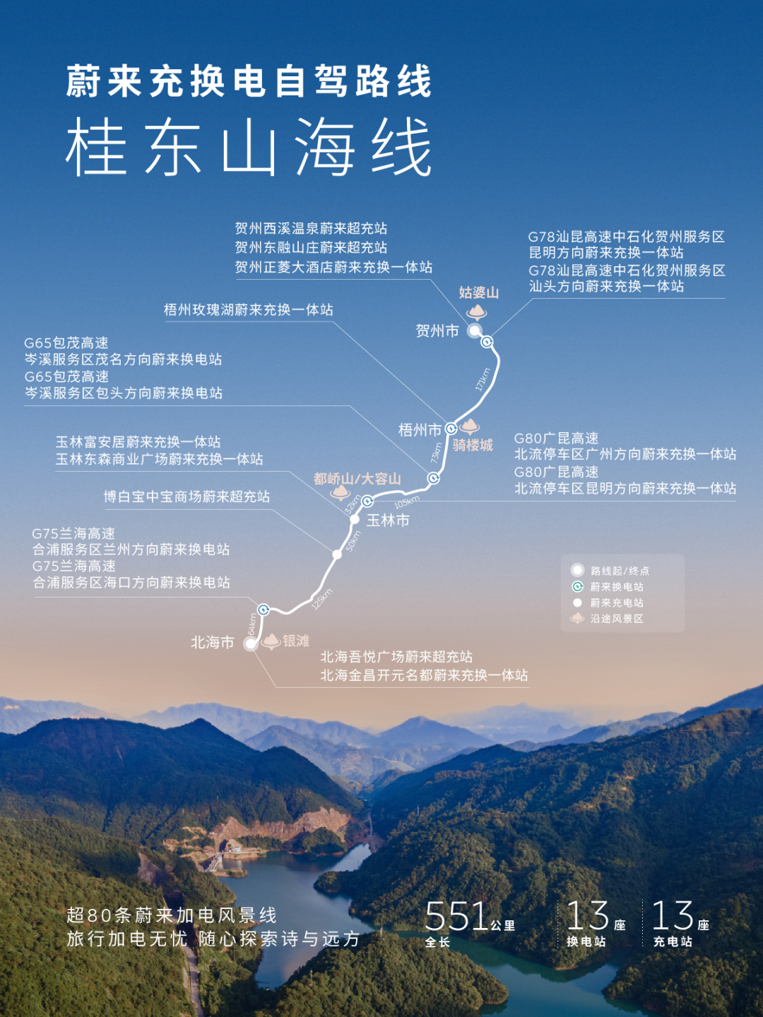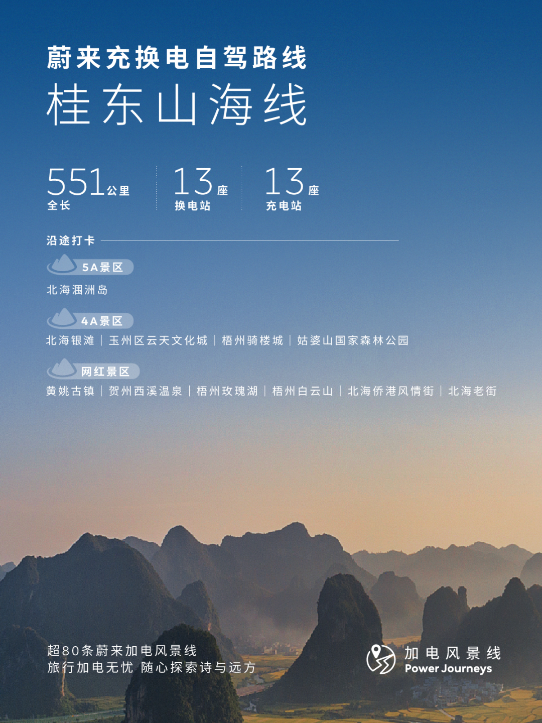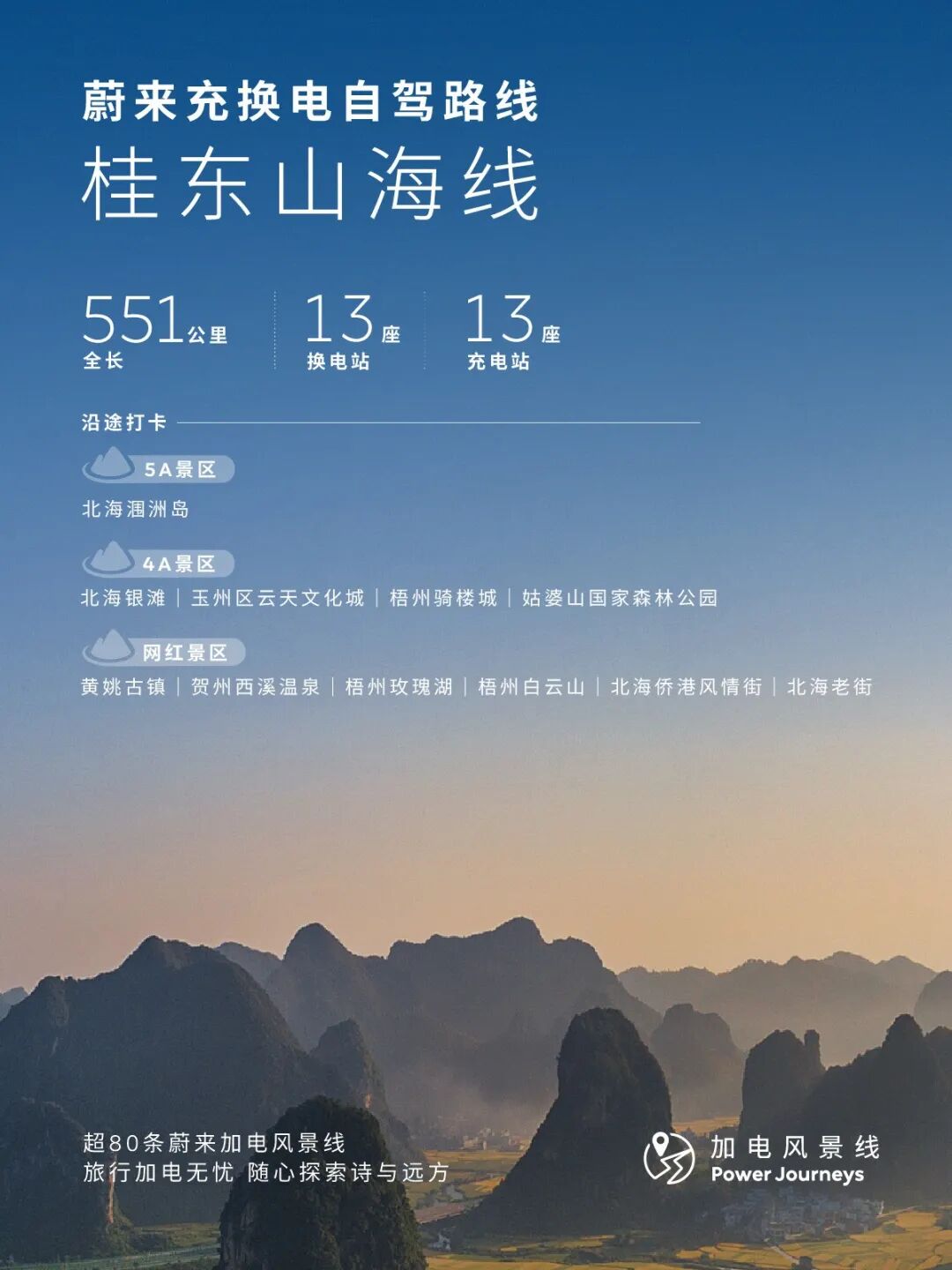 桂东山海线正式贯通,纵贯桂东南,从峰林秘境直抵碧海银滩,全程551km,串联贺州姑婆山、梧州骑楼城、玉林大容山、北海银滩4大IP,蔚来26座充换电站全程护航,山海奇遇一“换”即达。 🏞️姑婆山国家森林公园:景区内峰高谷深、森林繁茂、瀑飞溪潺、动植物丰富,集雄、奇、秀、幽于一体,被誉为南国天然氧吧,瀑布森林公园。🏯骑楼城:中国规模最大、保存最完好的骑楼建筑群之一,有“中国骑楼博物馆”之称。绵延数公里的骑楼街道,充满浓郁的岭南风情和南洋格调。🌉都峤山:“丹霞赤壁”都峤山,悬空寺群嵌于300米绝壁,玻璃栈道俯瞰万亩柚林。🌊北海:北海银滩以其滩长平、沙细白、水温净、浪柔软、无鲨鱼而闻名,被誉为“天下第一滩”。12公里石英细沙白浪逐帆,退潮后滩涂镜面倒映落日。春节旅行,加电无忧!截至目前,蔚来已经贯通超80条“加电风景线”,全国超过8600座蔚来充换电站,全程守护你的旅程,告别补能焦虑,把时光留给风景与故事。2026年,蔚来持续拓展充换电网络,新增1000座换电站、“加电风景线”将增至100条,陪你去更远的地方,探索更多的诗与远方。#蔚来 #蔚来换电去哪都方便 #自驾旅行首选换电 点击即刻预约试驾蔚来全系车型