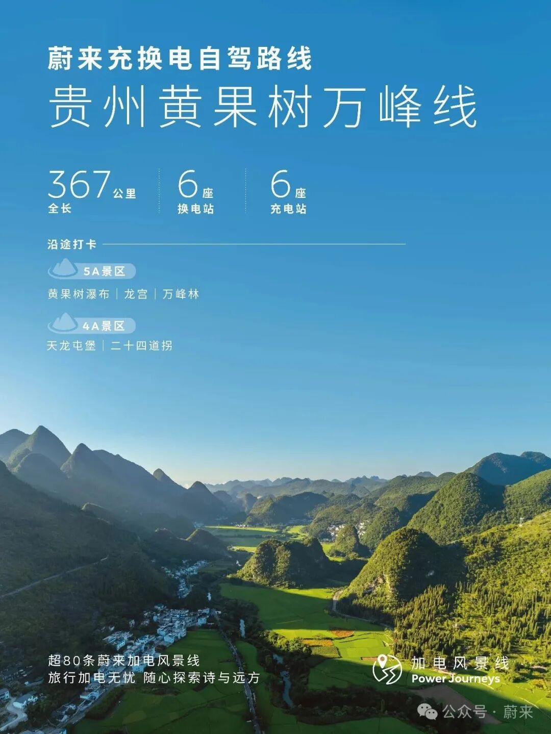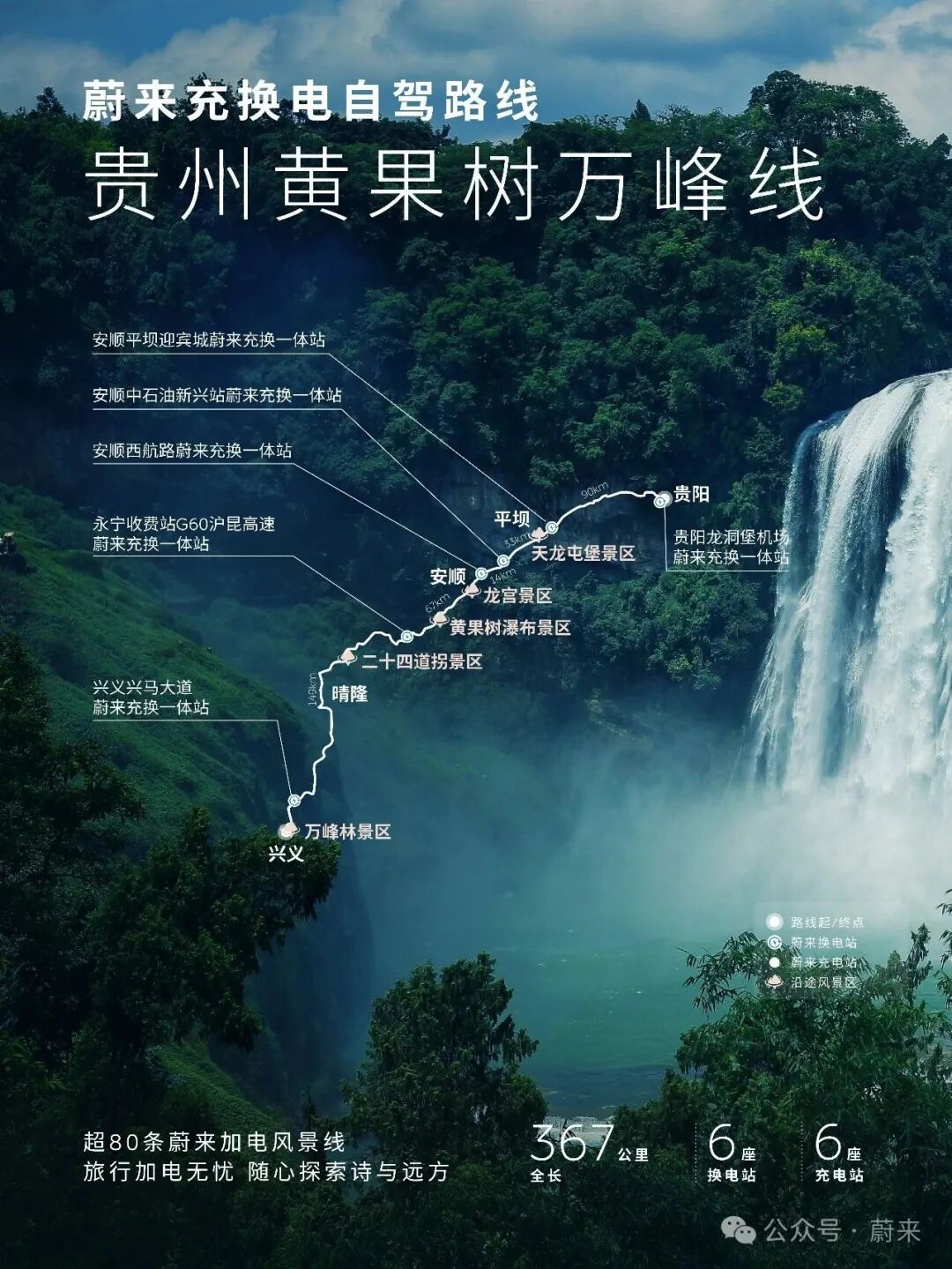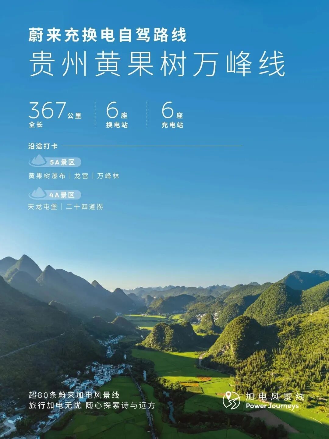 贵州黄果树万峰线,全程367km,沿途布局12座蔚来充换电站。春游贵州第二弹来袭!贵州自驾旅游推荐路线请收藏~从贵阳出发,探访古韵悠悠的天龙屯堡,探秘奇幻瑰丽的龙宫仙境,奔赴雄奇壮阔的黄果树瀑布,穿越险峻传奇的二十四道拐,最终抵达山水画卷般的万峰林,一路尽览黔地人文与自然奇观。🏯天龙屯堡:留存着大明遗风的千年屯堡村落,行走其间,仿佛穿越六百年时光,感受屯堡人家的质朴与厚重。🏞️龙宫:集溶洞、峡谷、瀑布、暗河于一体的天然奇观,被誉为“天下喀斯特地下龙宫”。🌊黄果树瀑布:亚洲第一大瀑布,气势磅礴、声如雷鸣。瀑布群串联陡坡塘、天星桥等多处胜景,集雄、奇、险、秀于一身,身临其境,方能感受大自然震撼人心的磅礴力量。🛣️二十四道拐:被誉为“抗战生命线”的历史奇观,既是震撼人心的公路奇观,也是承载红色记忆的历史地标,驾车穿行其间,感受天险与历史的双重震撼。🌿万峰林:中国最美喀斯特峰林之一,一座座山峰连绵成林,错落有致、气势恢宏。春日油菜花开遍地,峰林与田园相映成画,宛如世外桃源,令人心旷神怡。春节旅行,加电无忧!截至目前,蔚来已经贯通超80条“加电风景线”,全国超过8600座蔚来充换电站,全程守护你的旅程,告别补能焦虑,把时光留给风景与故事。2026年,蔚来持续拓展充换电网络,新增1000座换电站、“加电风景线”将增至100条,陪你去更远的地方,探索更多的诗与远方。#蔚来 #蔚来换电去哪都方便 #自驾旅行首选换电 点击即刻预约试驾蔚来全系车型