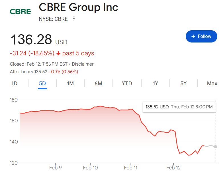 周三,由于投资者担心人工智能可能实现办公自动化,导致大量失业,从而令办公楼需求下降,房地产服务公司股价也集体下跌,直到周四也没有缓过气来。