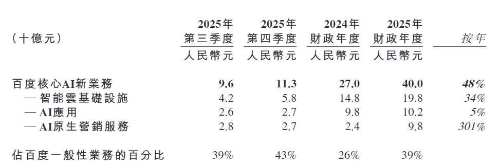 从2025年第四季度开始,百度将“百度核心”重新定义为“百度一般性业务”,而百度一般性业务包括三个板块:百度核心AI新业务、传统业务及其他。其中,百度核心AI新业务包括智能云基础设施、AI应用、AI原生营销服务;传统业务则由搜索、信息流及其他产品线提供的传统广告服务组成。