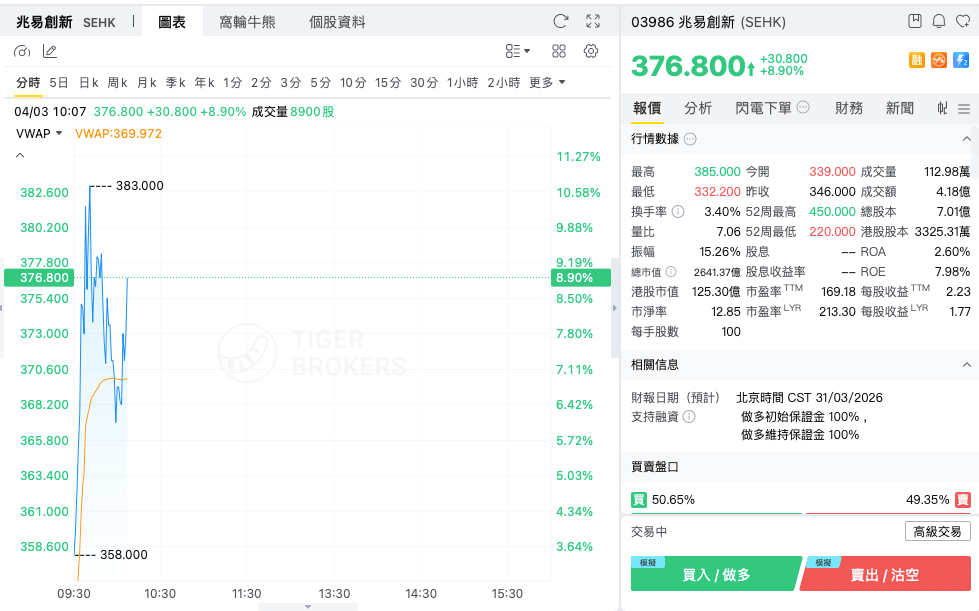 3月4日,兆易创新逆市涨超8%,截至发稿,涨8.90%,报376.8港元,成交额4.18亿港元。