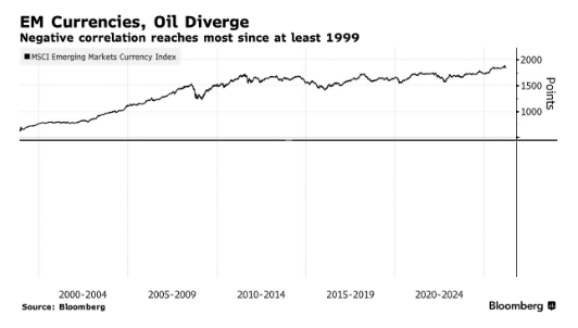 智通财经APP获悉,中东局势不仅打破了原油与新兴市场货币长达数十年的联动关系,更令二者走势彻底反转,相关系数跌至至少27年来最低水平。