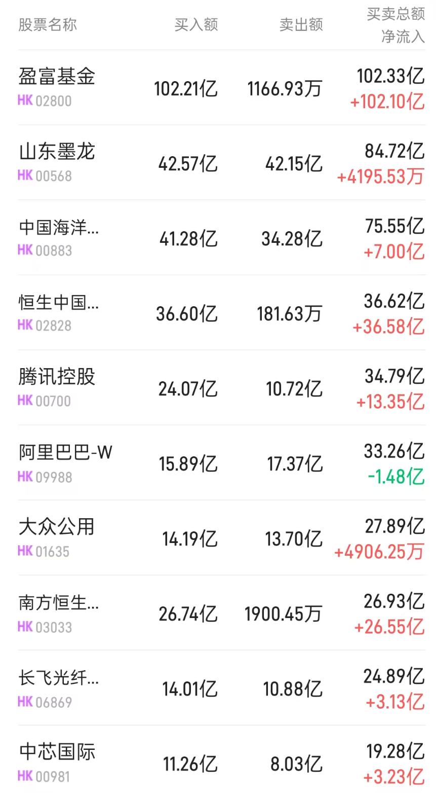 北水净买入最多的个股是盈富基金(02800)、恒生中国企业(02828)、南方恒生科技(03033)。北水净卖出最多的个股是中石化(00386)、长飞光纤光缆(06869)。