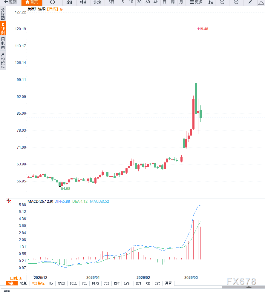从4小时走势来看,油价在此前快速上涨之后进入高位震荡整理阶段。短期动能指标显示上涨动力有所减弱,MACD出现一定程度的顶背离迹象,意味着多头动能正在阶段性降温。目前价格主要运行在81美元至83美元区间内波动,如果跌破81美元,短线可能再次测试80美元关键支撑;若重新突破85美元,则意味着上涨趋势可能重新启动。整体来看,原油市场短期或维持震荡格局,但在供应风险依然存在的背景下,中期趋势仍然偏向上行。