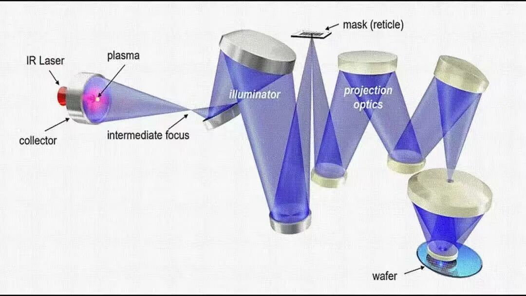另外,EUV在照明系统中的每一次反射都会损失约三成能量,经过反射镜阵列,最后到达晶圆的光线大概只能剩下2%左右。反射过程中被吸收的能量也必须用大功率散热系统进行冷却。光源的稳定性和聚光元件的保护也是巨大的挑战,因为用于激发的激光器本身存在抖动,激光与等离子体作用时产生的污染将会对光源聚光元件造成影响和破坏。