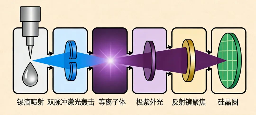 第一次轰击使用低强度的预脉冲撞击圆形锡滴使其膨胀,变成薄饼型。由于薄饼锡受光面积大,光强增大。然后第二次高强度的主脉冲以全功率撞击薄饼锡,锡原子被电离,产生高温、高密度的等离子体云,就在这团等离子体冷却衰变的极短瞬间,锡离子会释放出波长为13.5纳米的极紫外光子。收集镜捕获等离子体发出的EUV辐射(13.5nm),将其集中起来传递至曝光系统。
