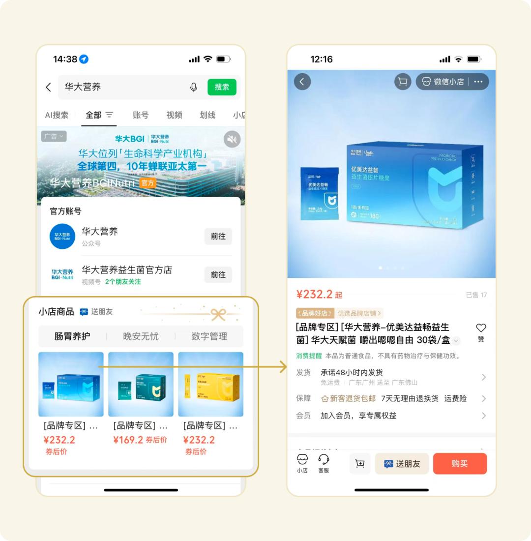 日常的品牌搜索同样是主动需求型流量的重要来源。比如当用户搜索“华大营养”,会在搜一搜品牌专区内看到小店商品一栏,肠胃养护、晚安无忧、数字管理等主打产品一目了然。用户点击感兴趣的产品,即可直接进入微信小店商品详情页完成购买。