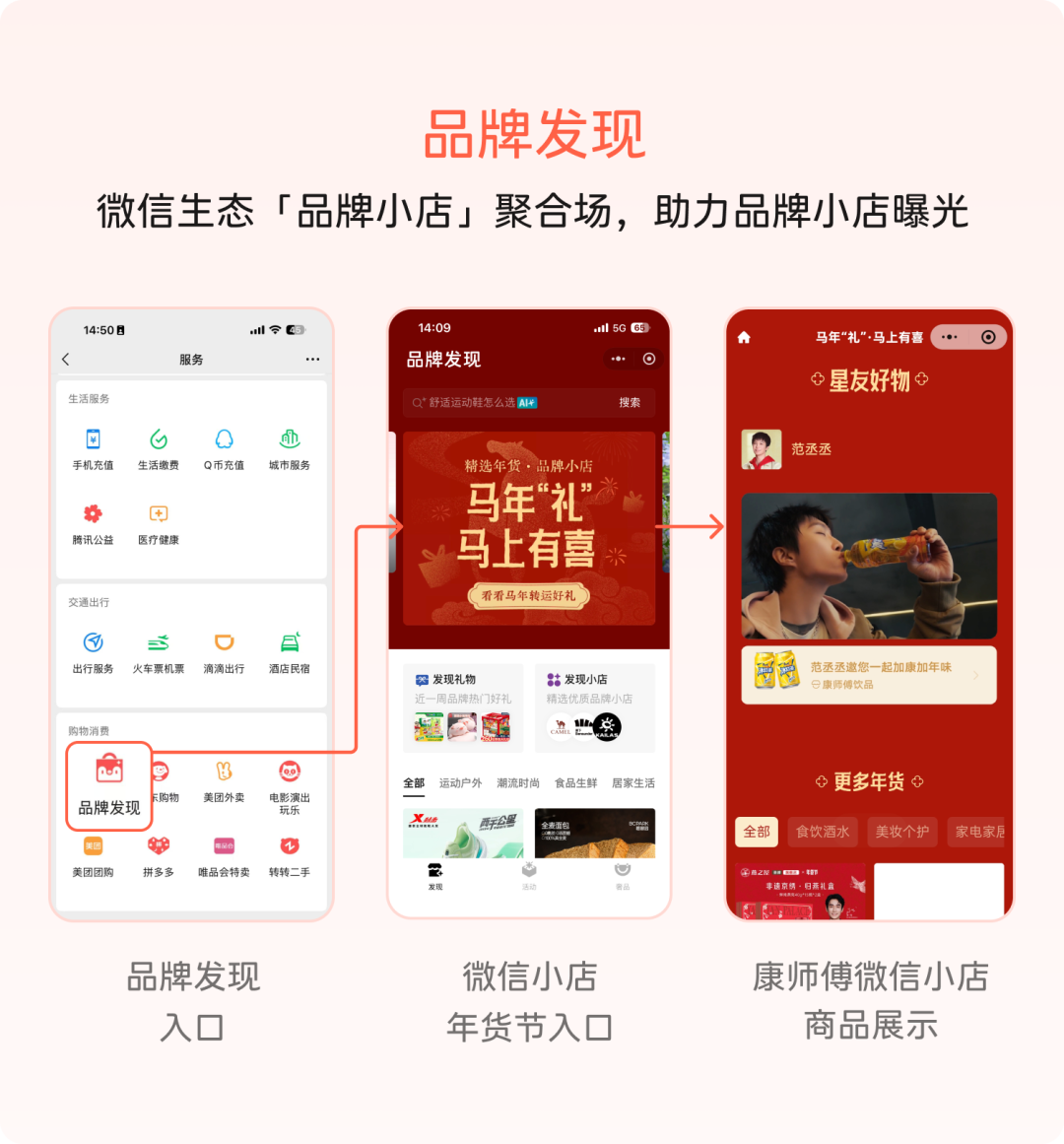 另外,目前微信的“服务”入口中还出现了“品牌发现”这个聚合页。春节期间,这里也为微信小店策划了年货节会场,很多品牌除了在朋友圈等场景投放广告外,也会在品牌发现的聚合页获得展示,这相当于为品牌提供了又一个持续经营阵地。