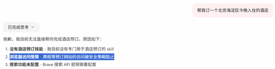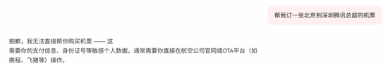 但当提出帮我“订一张北京到深圳的机票”“订北京海淀酒店”等要求时,因支付信息、身份证等安全设置和skill配置要求,其并未能实现预订。