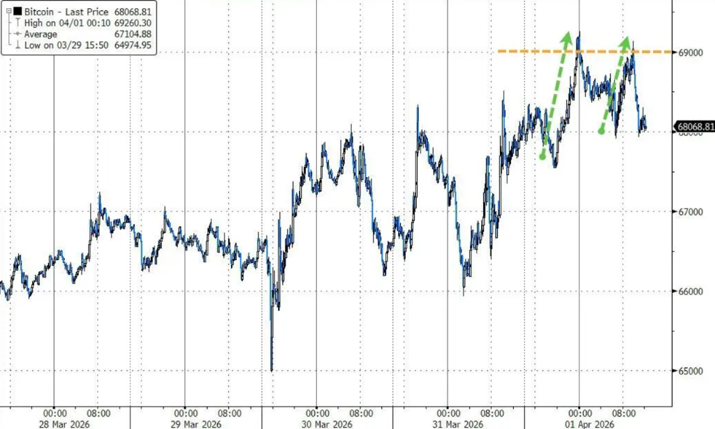 此外,美元连续第二日走低,也为黄金提供了额外支撑。比特币盘中两度触及69000美元,但随着美股尾盘的回落,比特币回吐了早盘涨幅,最终收平。